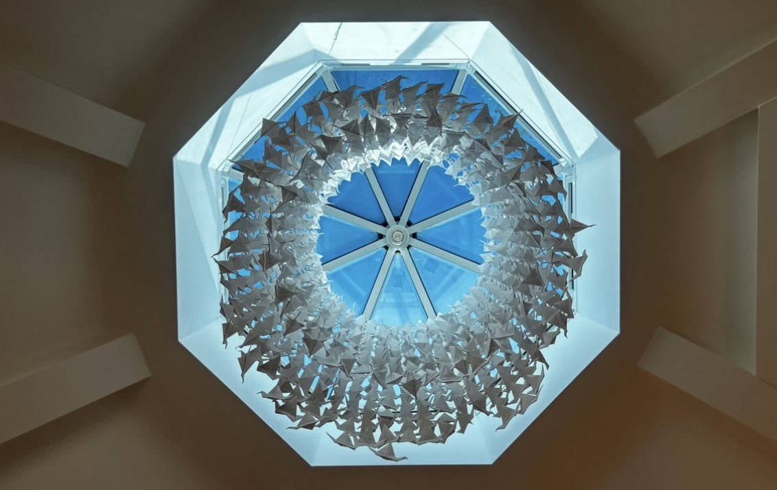 Senbazuru ( 1000 cranes ) is a Japanese prayer. Initially installed as part of the Binnel Artists’ exhibition at the hospice this has remained for visitors, staff, and patients to experience.