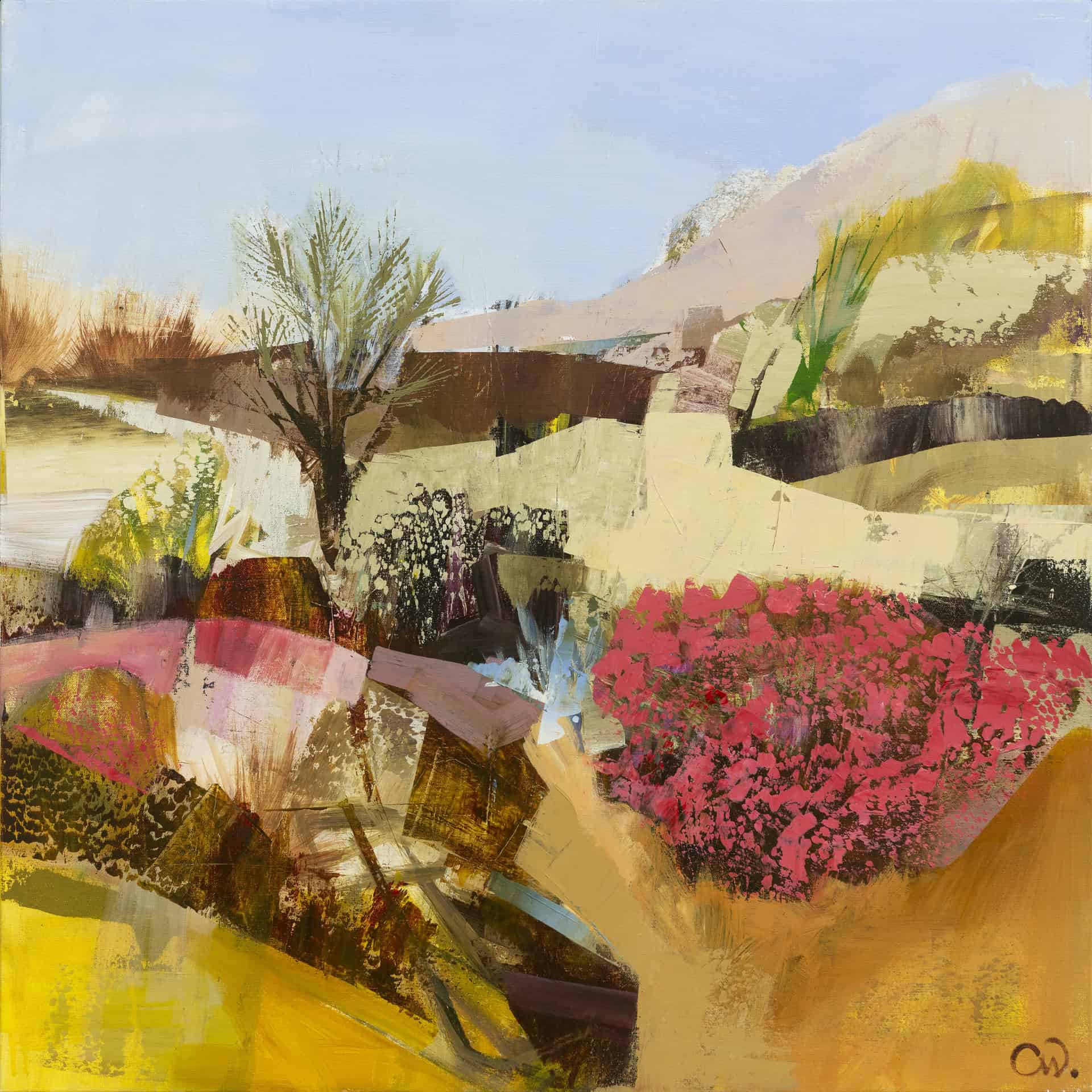 Her paintings are semi-abstract, vibrant, energetic, and colourful, and although they depict the landscape, they are very much about her representing a visual diary and life events. Some of her most recent paintings are a response to climate change. Sometimes brooding, sometimes optimistic, they always reflect her mood.