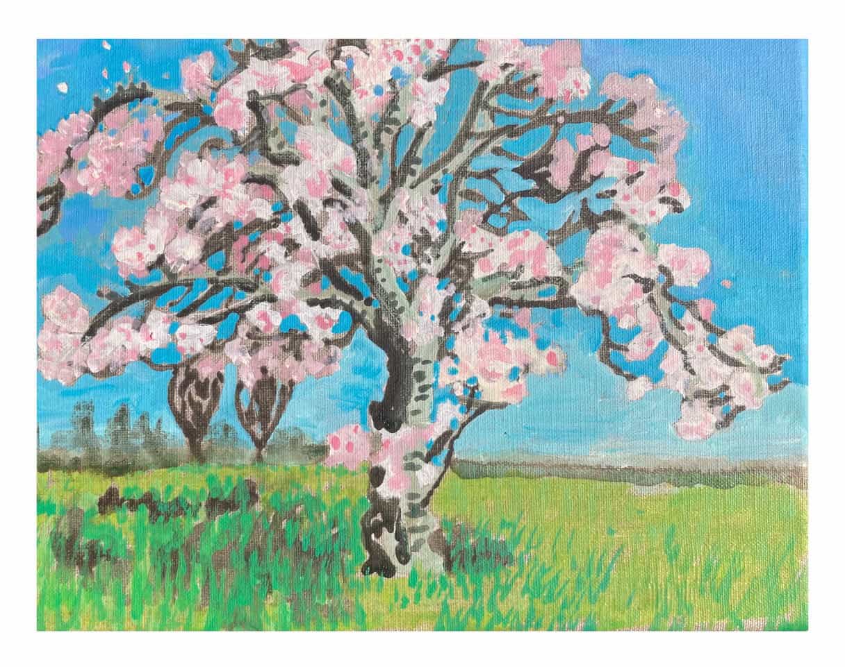 Her latest series of paintings, “Mono no aware” – a Japanese phrase for an awareness of the impermanence of things – explores the temporary spectacle of cherry blossom in bloom. Sadie found trees to paint in full bloom, sometimes in unexpected locations, such as beside the ambulance station in Newport.