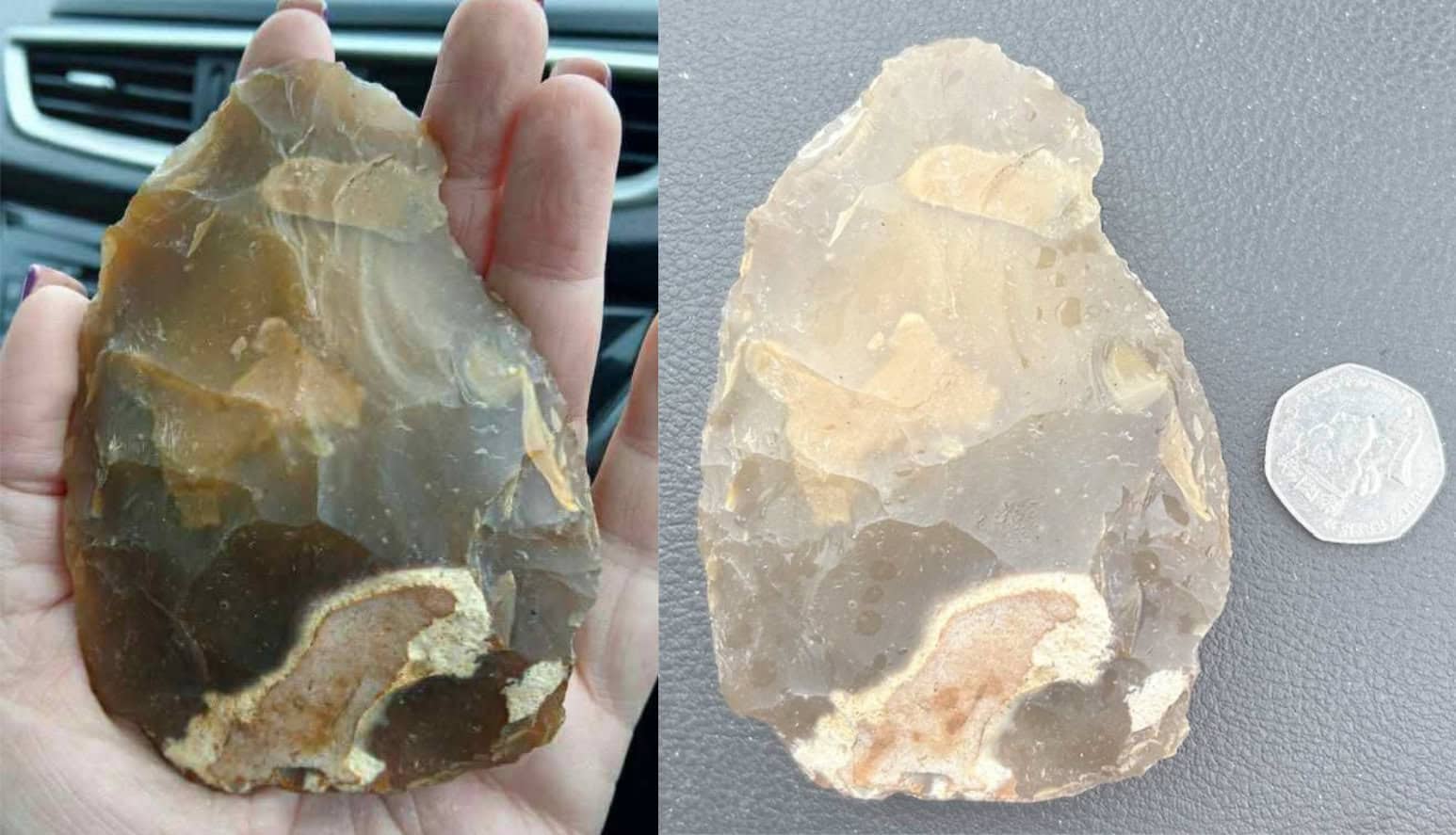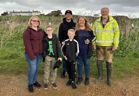 Mel Harrison, who was on a guided fossil hunt along with keen fossil hunters Jack (9), Charlie (9), husband Tony and friend Laura, led by “Island Gems Fossil Trips” last Wednesday (29th Oct 2025), picked up a hand-sized flint stone which the tour guide, Martin Simpson immediately recognised as a Stone Age implement.