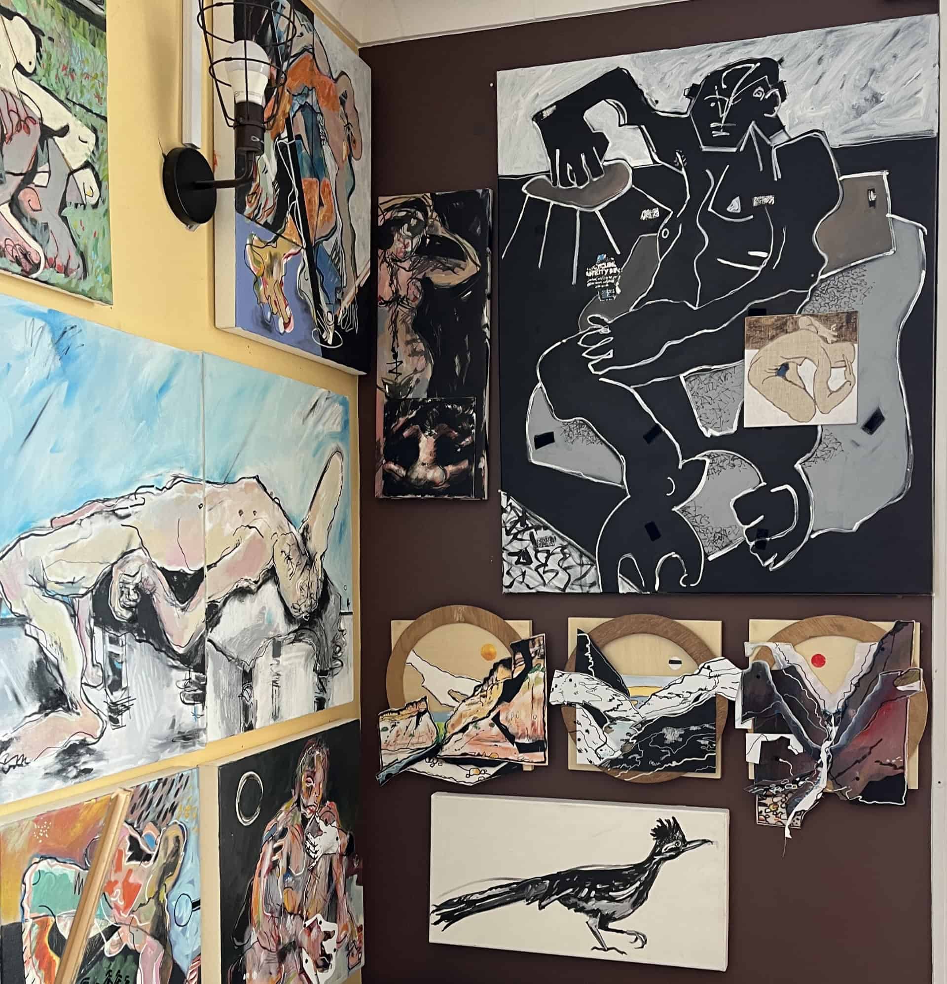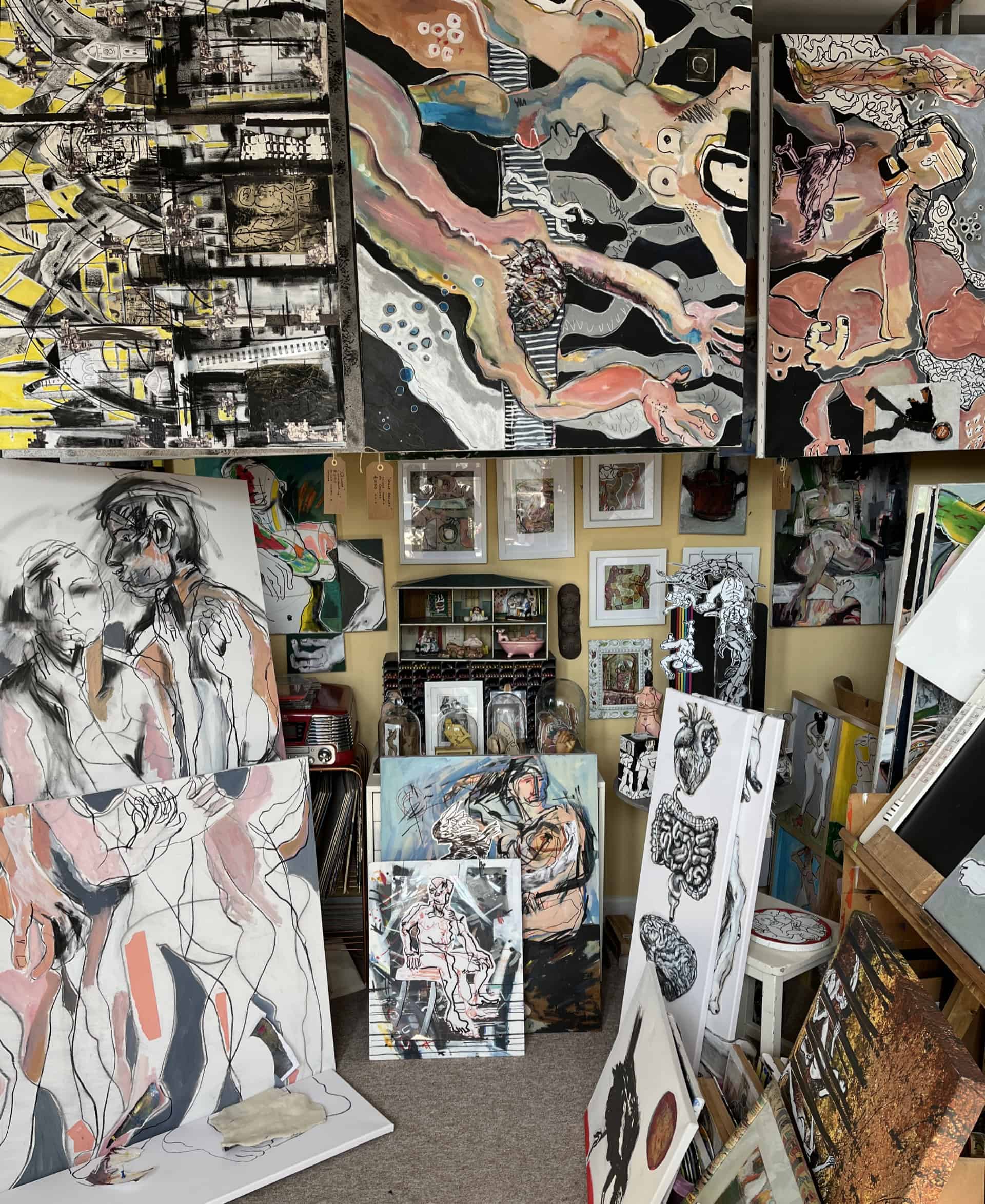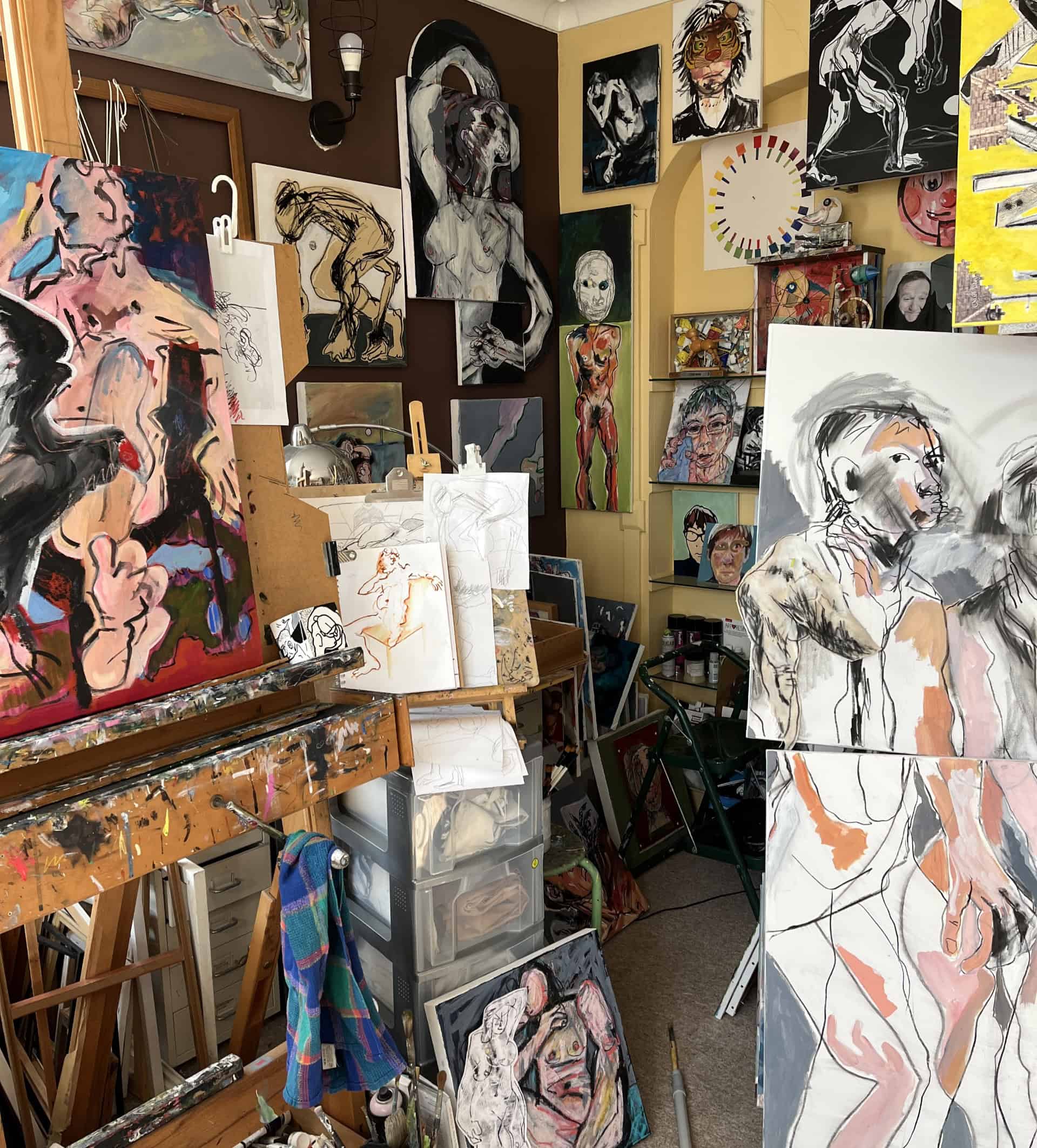 She has re-hung the walls of her studio with new pieces, all of which are available to buy at reasonable prices.