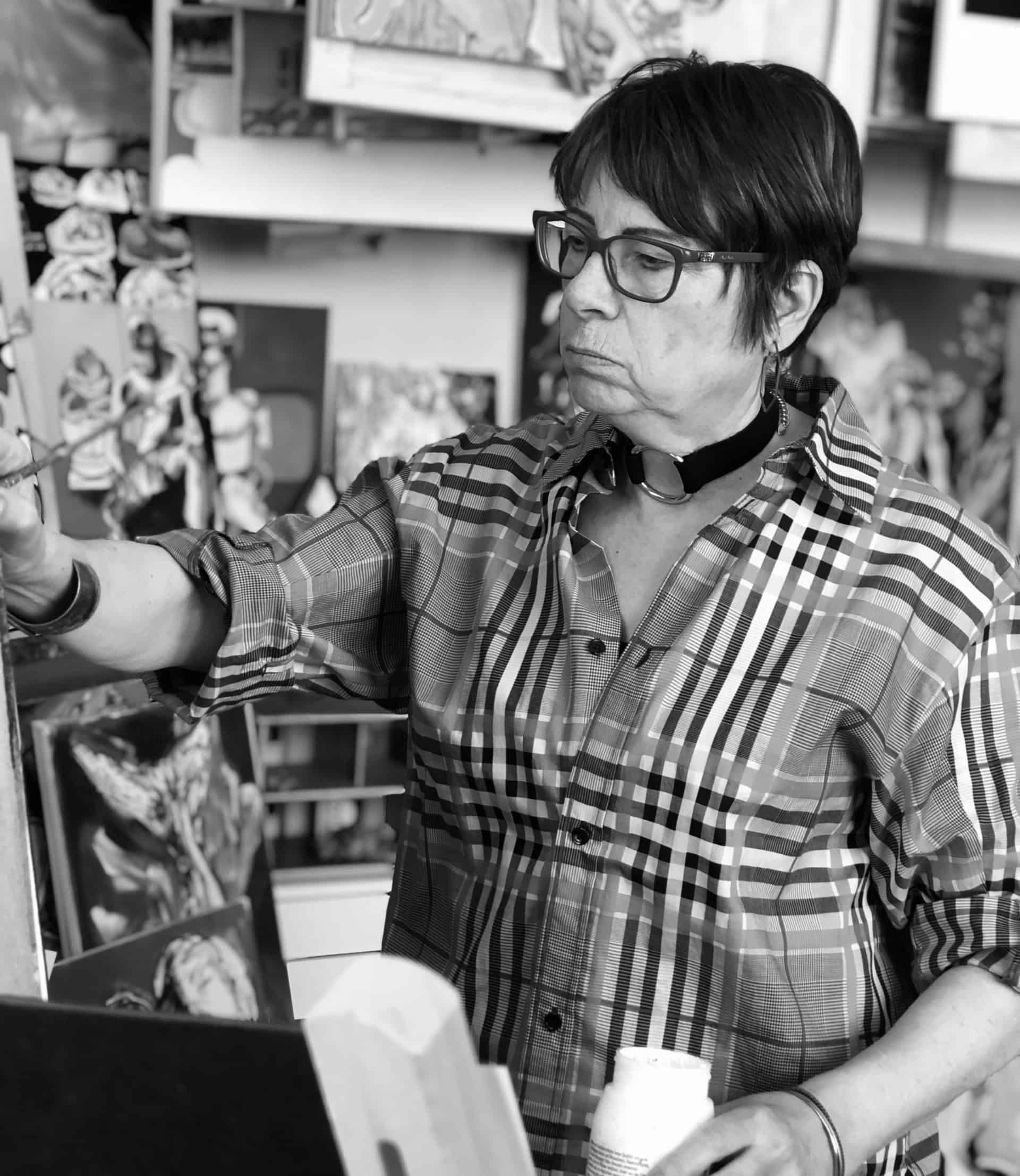 Sandy’s style is vigorous, colourful and often playful. Much of her work centres around the drawn figure.
